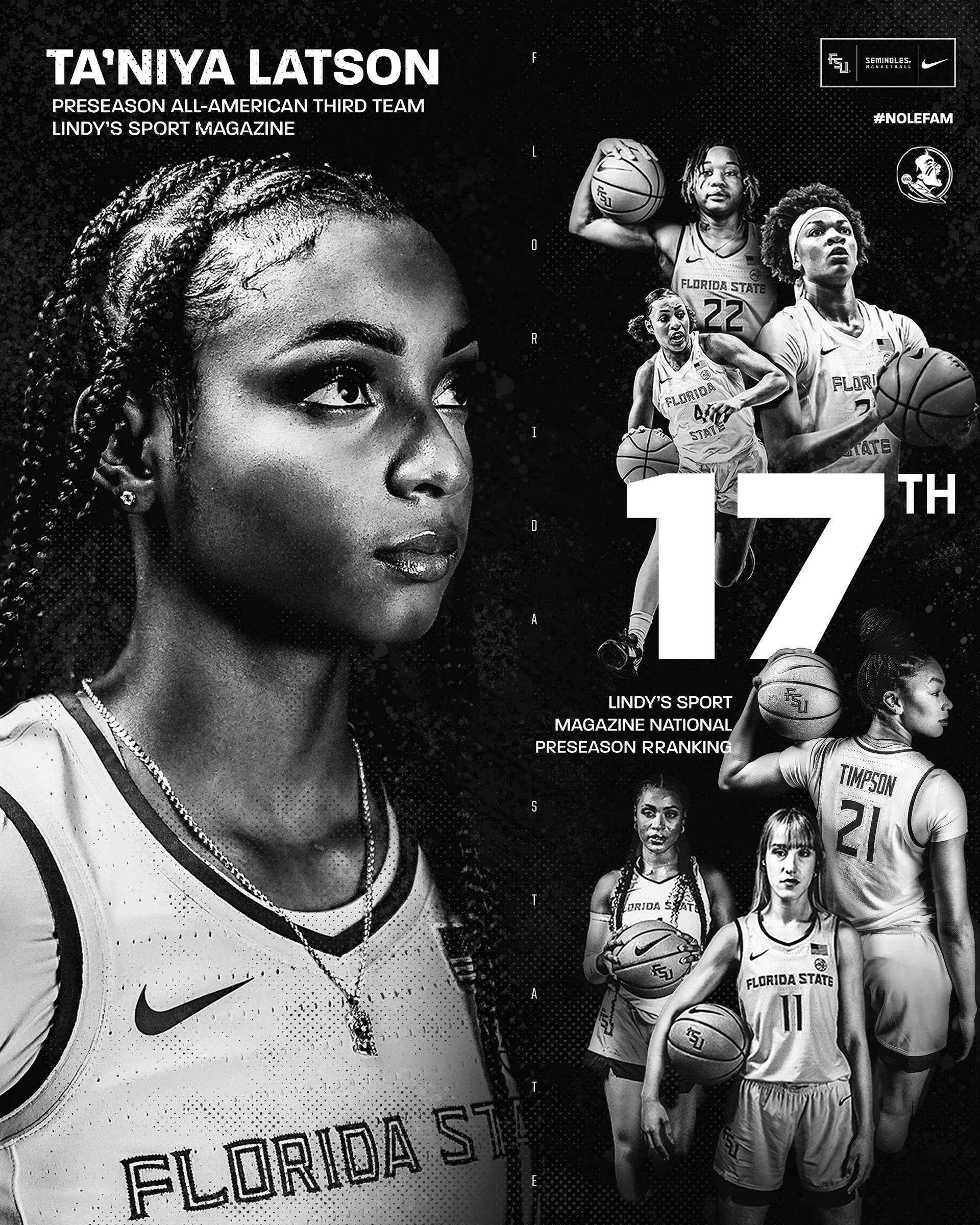 I was tasked with creating a preseason awards announcement graphic for FSU Women’s Basketball social pages. Originally, this graphic was one singular post but was changed to a two-image post. This black and white version was the first draft and the two seminole garnet graphics are the final that was posted.